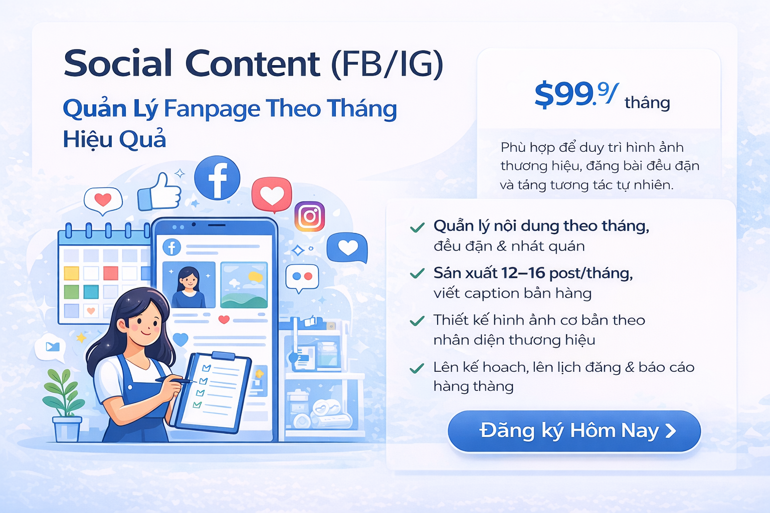 Xây dựng và sản xuất 12–16 bài post mỗi tháng, bao gồm nội dung chia sẻ, giới thiệu dịch vụ và nội dung tương tác, giúp fanpage luôn mới và có giá trị với người theo dõi.